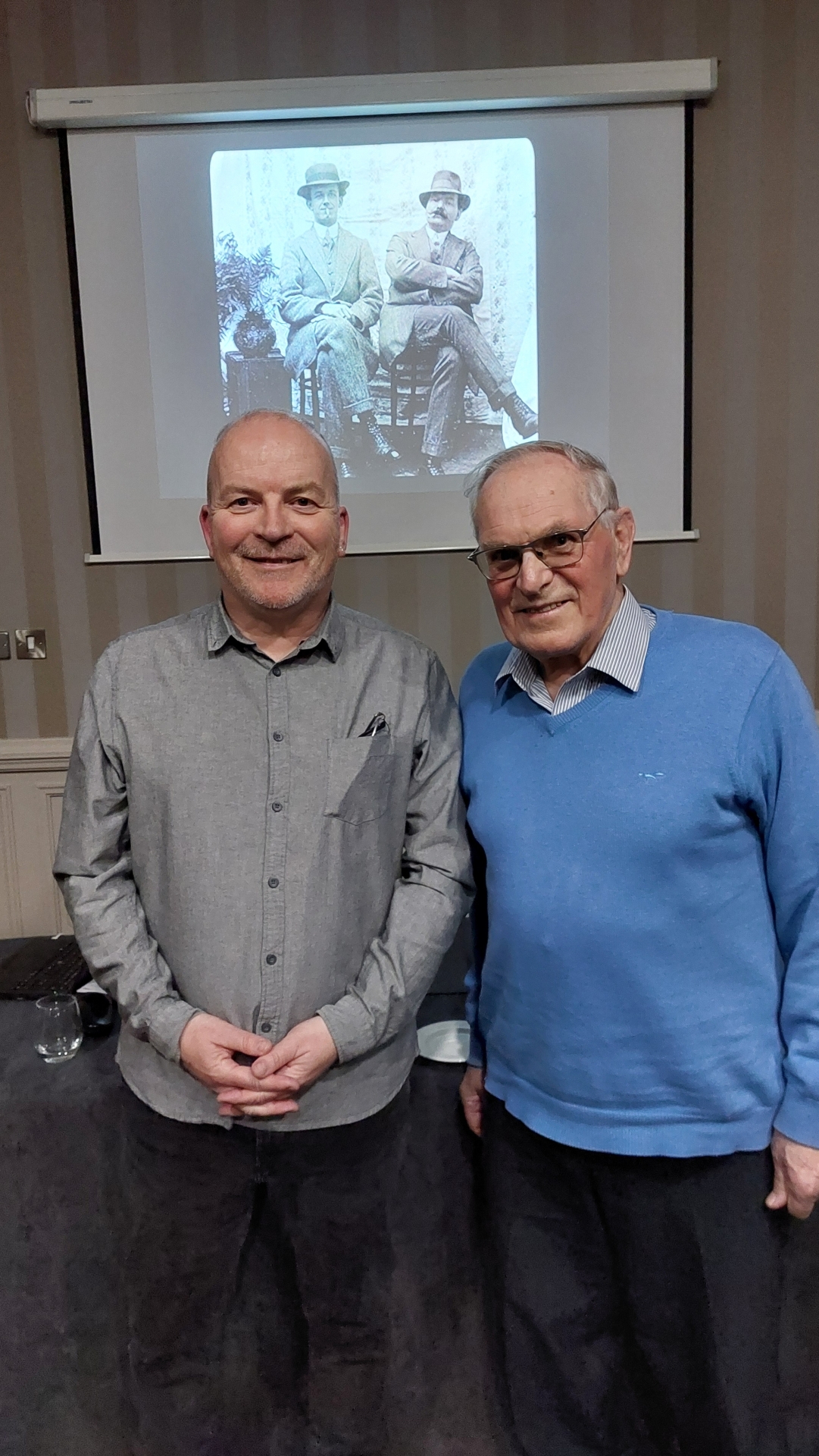 Paul Delany with Teddy Fennelly at the Spring talk by Laois Heritage Society in the Midlands Park Hotel. Behind them is an image of the two founders of the Portlaoise Electric Cinema, Paul's grandfather Paul Delany and his relative Patrick Delany. Photo: Lynda Kiernan
