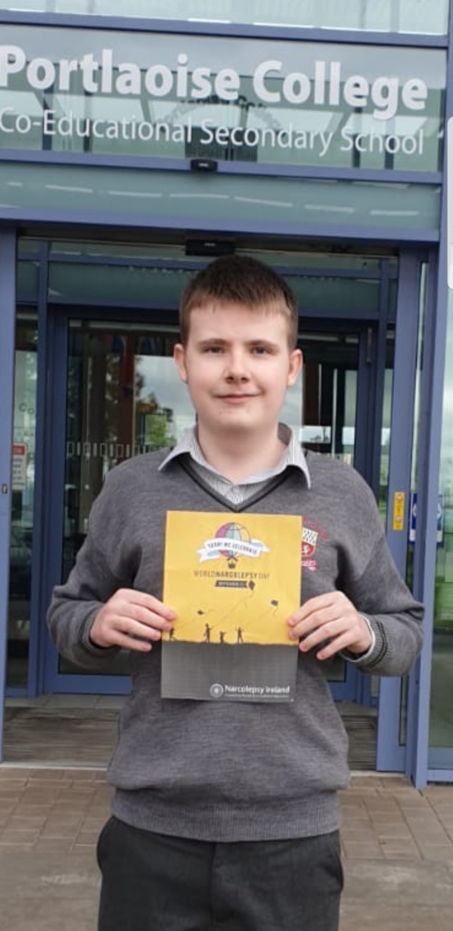 Dara Bray Egan outside Portlaoise College on World Narcolepsy Day