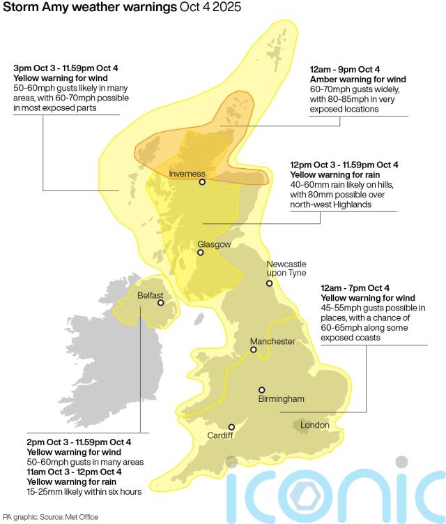 The Met Office said Storm Amy is likely to bring a period of damaging south to south-westerly winds during the late afternoon and evening on Friday, with gusts of 60-70mph (97-113kph) inland and up to 80mph along some more exposed coasts.