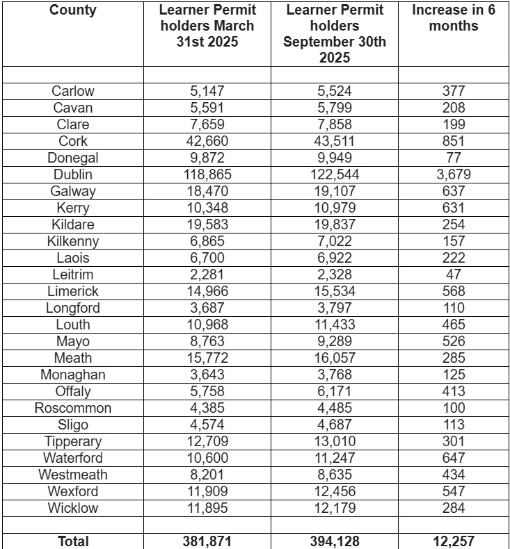 The Laois man warned that the surge in learner drivers on our roads poses a direct threat to Irish road safety. MORE BELOW FULL TABLE.