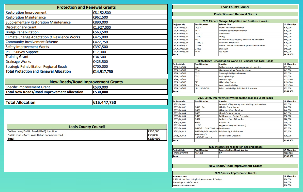 Nevertheless, the council will be able to advance work on roads around Laois, though some of the money was already announced. See the full tables of funding below.