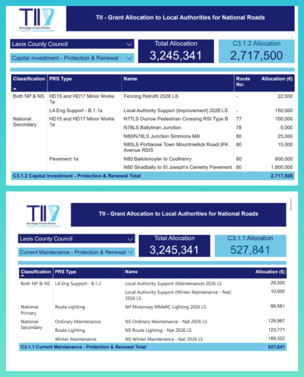 Tables show money allocated to Laois County Council for local and regionall road projects.