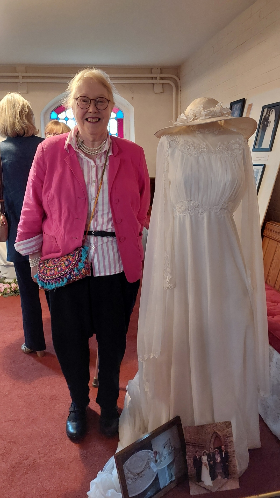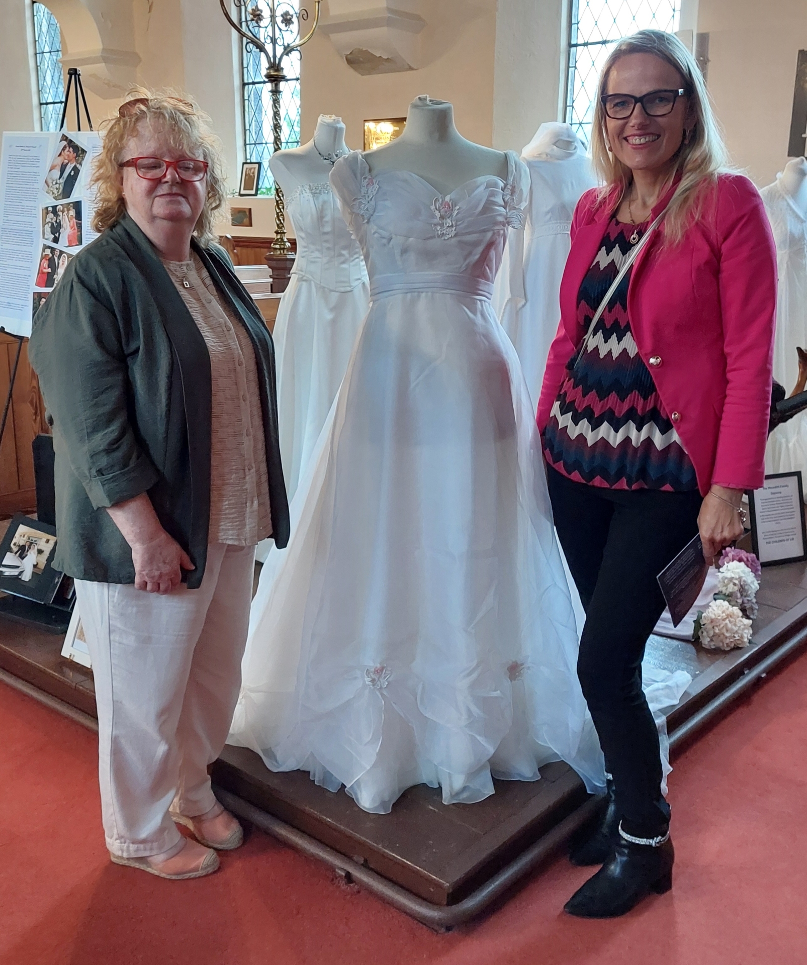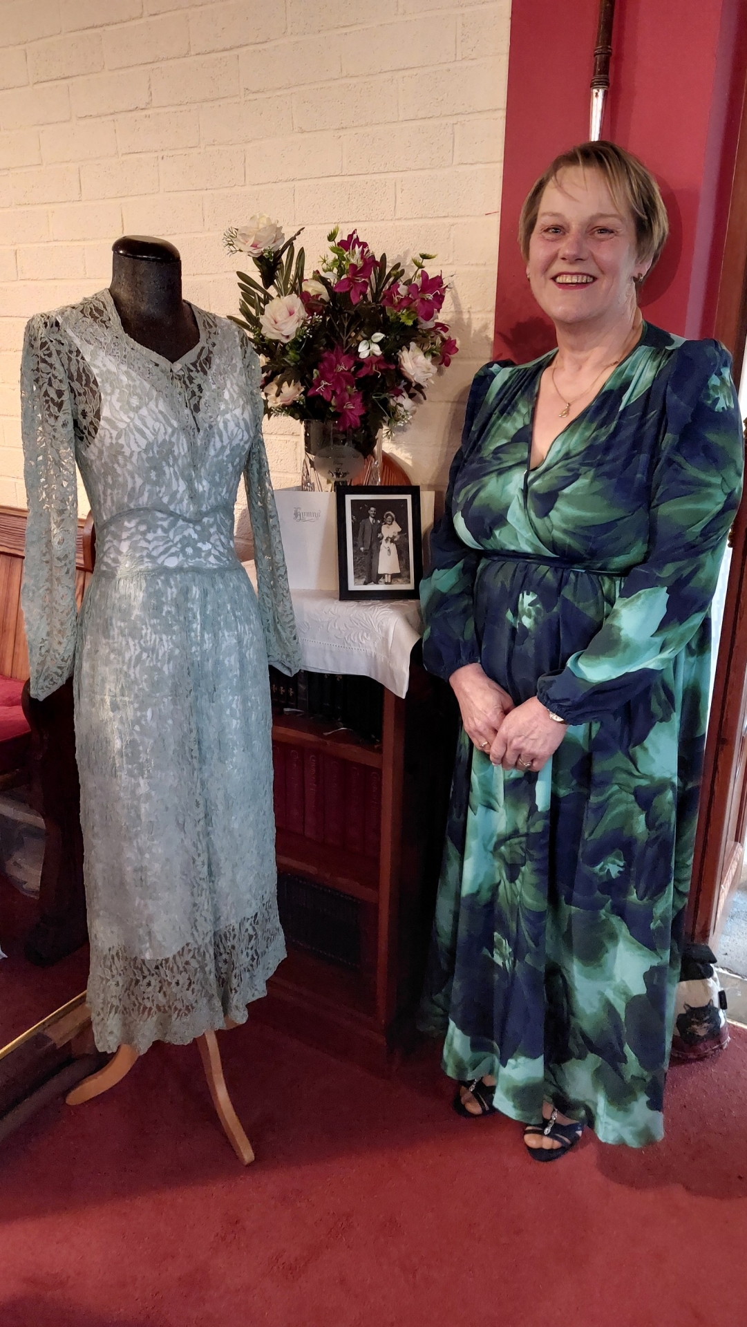 Organiser Janet Stewart beside the 1951 wedding gown of Mrs Jenny Perry.
