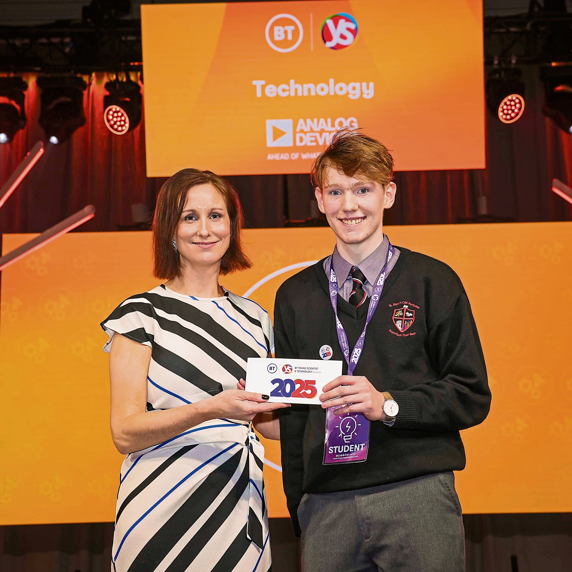 Joshua Corbett from St. Mary's C.B.S. Portlaoise being presented with the second place Senior Individual Technology Category Award from Therese Gunning, Legal Director at BT Ireland, at this year's BT Young Scientist Competition in the RDS in Dublin.