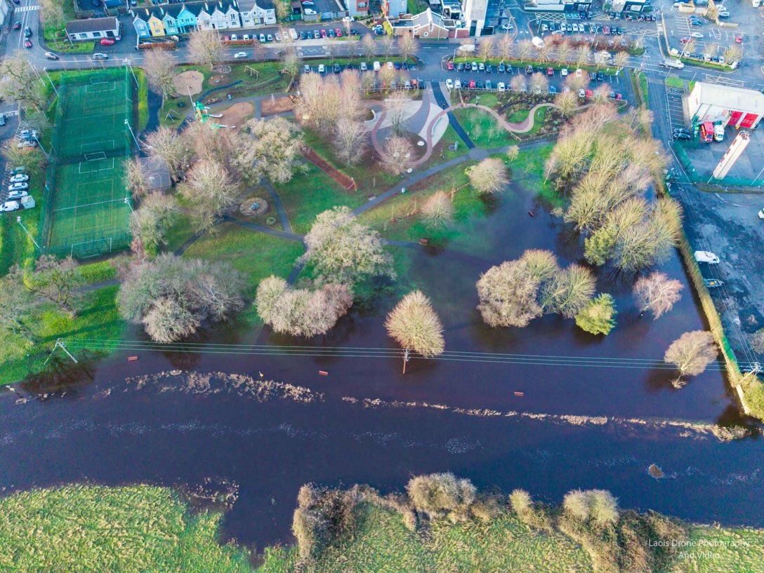 Laois photographer Con Murphy has captured incredible drone photographs of the flooding in People's Park, Portarlington as the Barrow's riverbanks burst.