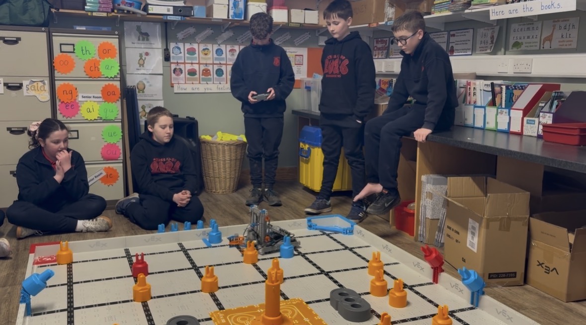 Students participated in the regional VEX IQ competition in Mountmellick Community School in February of this year, under the name of the ‘Shanahoe Stackers’.