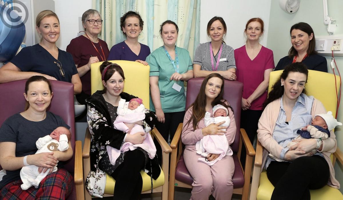 The mums, their babies and maternity staff were caught on photographed with maternity Department staff by Michael Scully on January 1 for the Leinster Express. FULL CAPTION BELOW PICTURE.