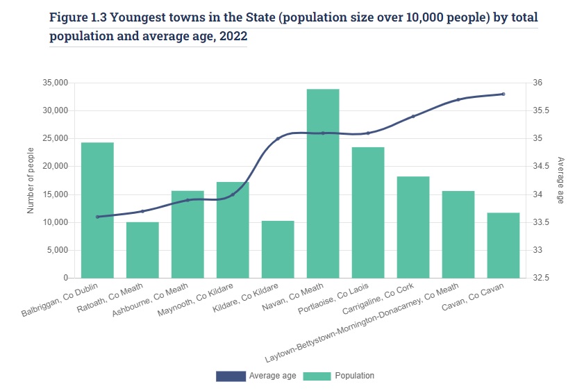 Elsewhere in Laois, Ballyroan takes the title of the youngest small town (pop +500) with an average age of 34.1 years.