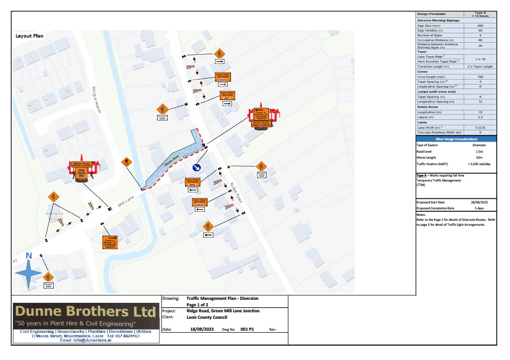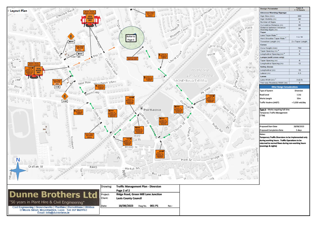 Laois County Council has advise of its intention to close the L-21205 at Green Mill Lane, in Portlaoise from the junction with the L2120 Ridge Road to the Bridge at Green Mill Lane at the entrance to Triogue Manor Housing Estate