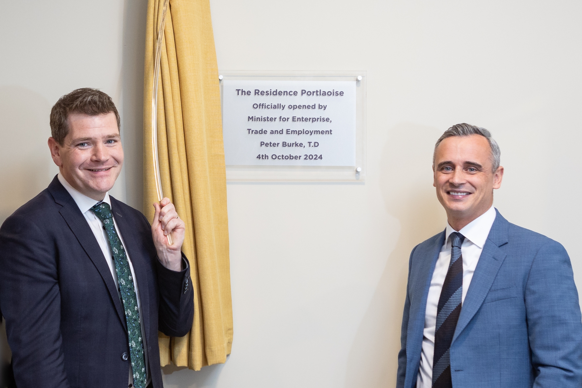 Mr. Peter Burke, minister for Enterprise Trade and Employment, with Neal McGroarty CEO emeis Ireland, unveiling the plaque to mark the official opening of The Residence Portlaoise.