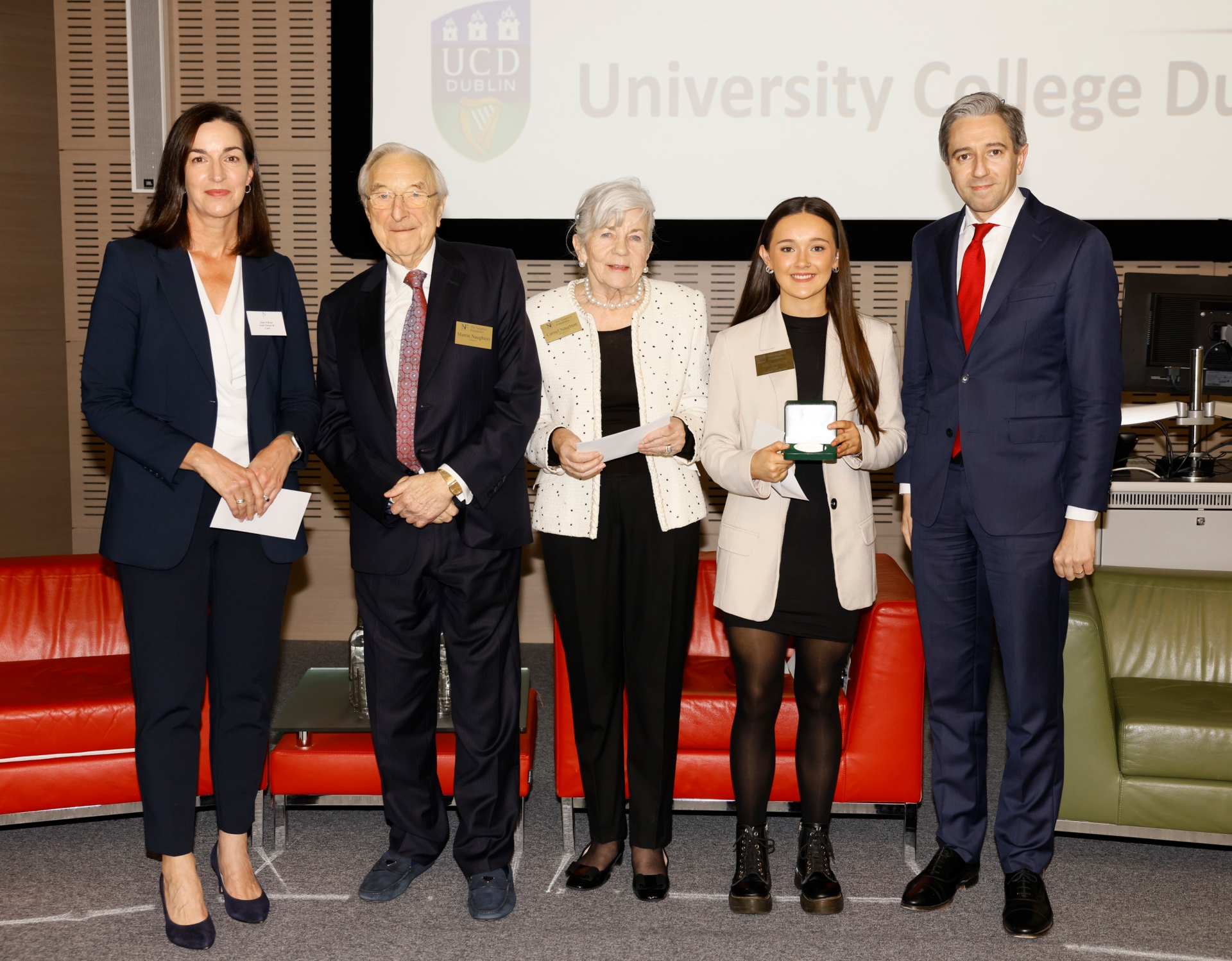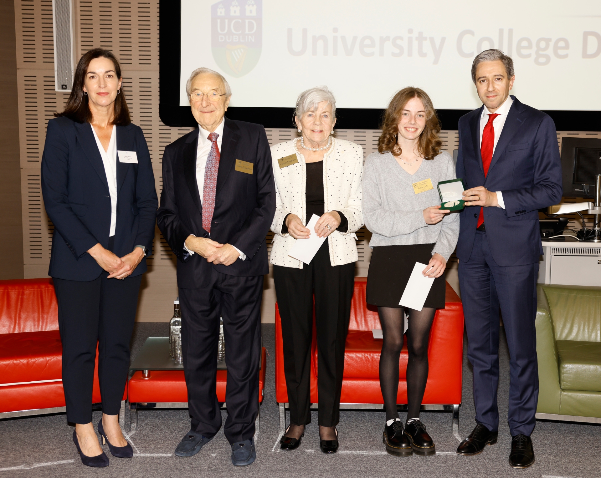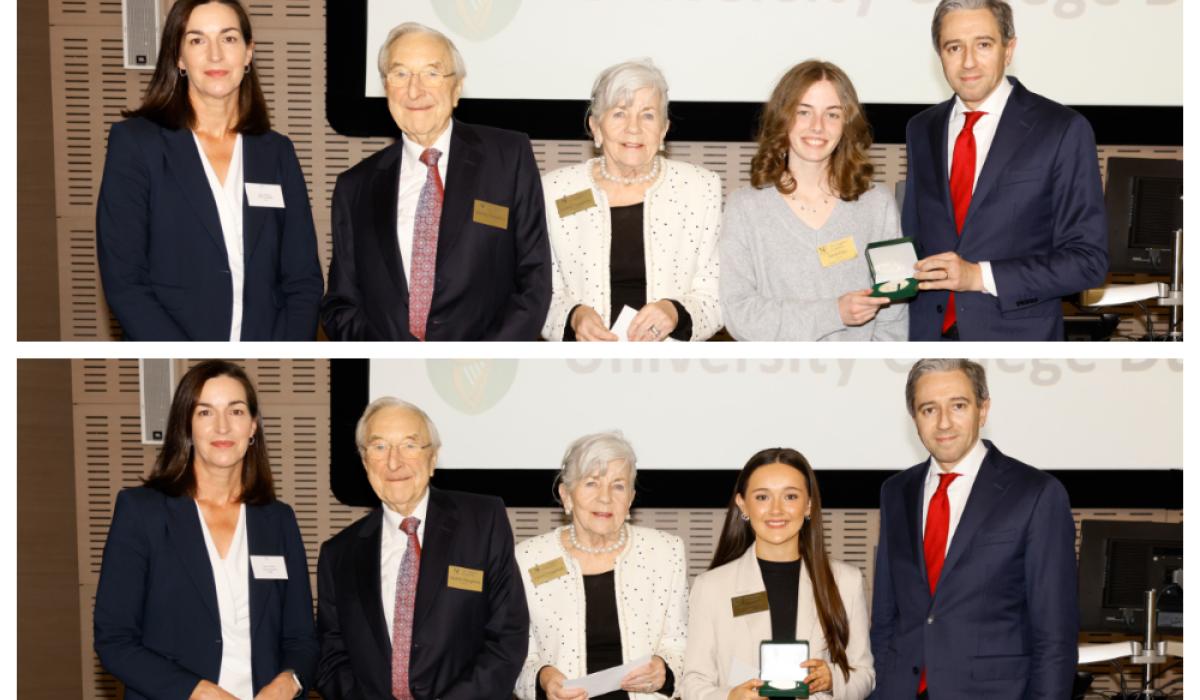 Sarah Daly and Ella McNulty, both former students of Scoil Chríost Rí, Portlaoise, were presented with the awards and cheques by founding patrons of the Naughton Foundation, Dr. Martin Naughton, and his wife Carmel, who were joined by An Taoiseach Mr Simon Harris. CONTINUE READING BELOW PHOTO