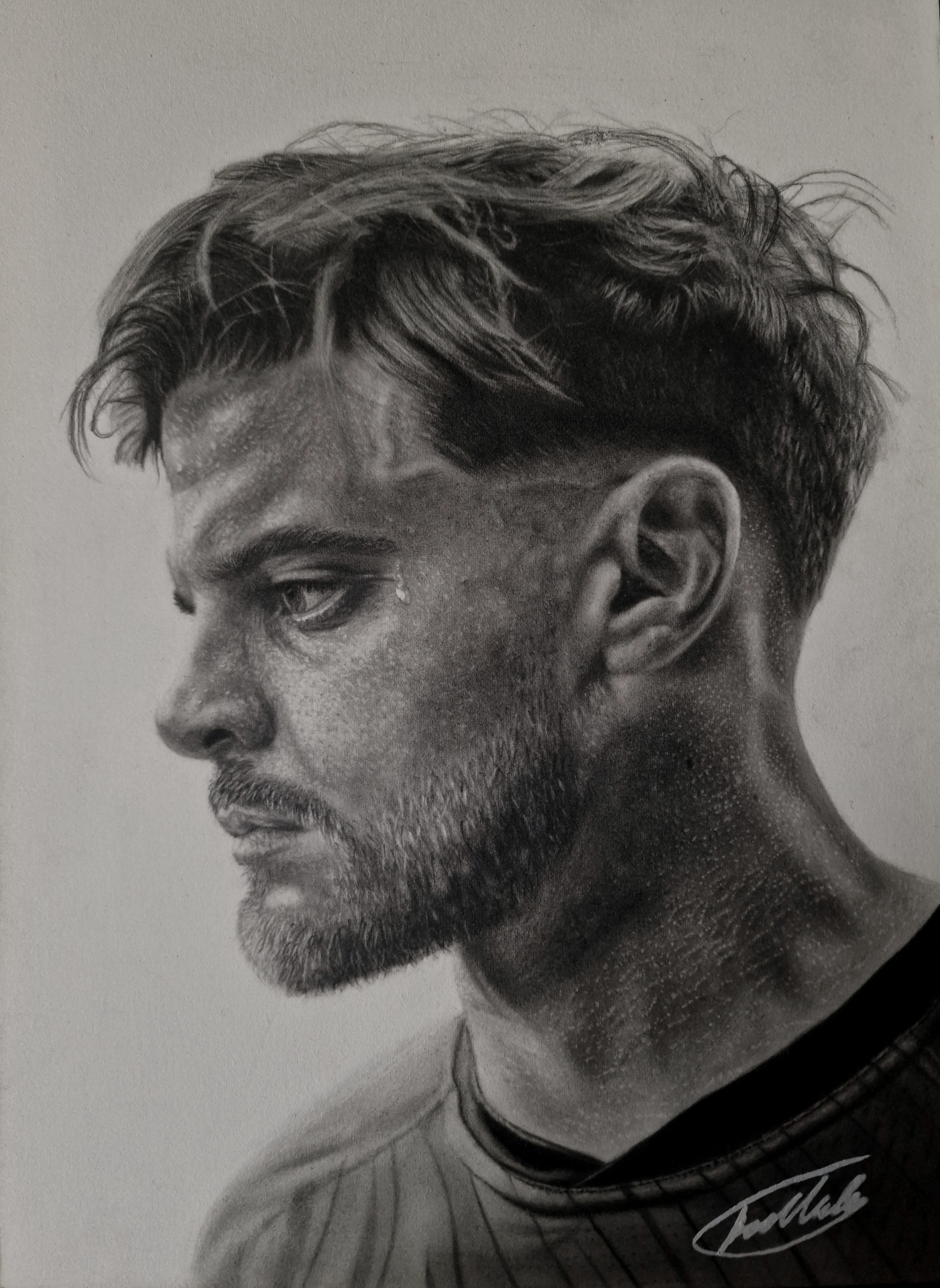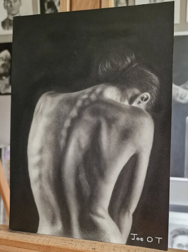 Never having studied art in school, he discovered his talents unexpectedly in 2021 when sketching a character from a television programme he was watching. The quality of his work has progressed rapidly ever since, and his personal style developed towards the distinctive pieces he is producing today.