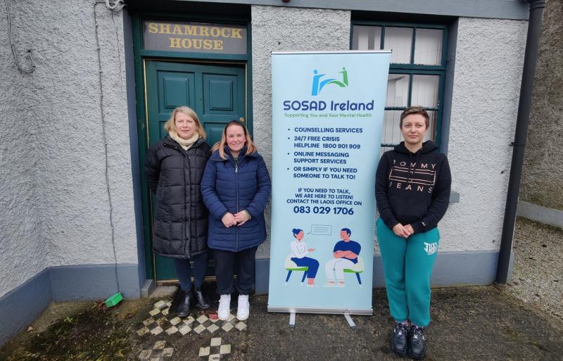 Fiona Redmond trainee coordinator, Vicky Dalton Coordinator and Kate Pavlenko administrator. at SOSAD Laois in 2024.