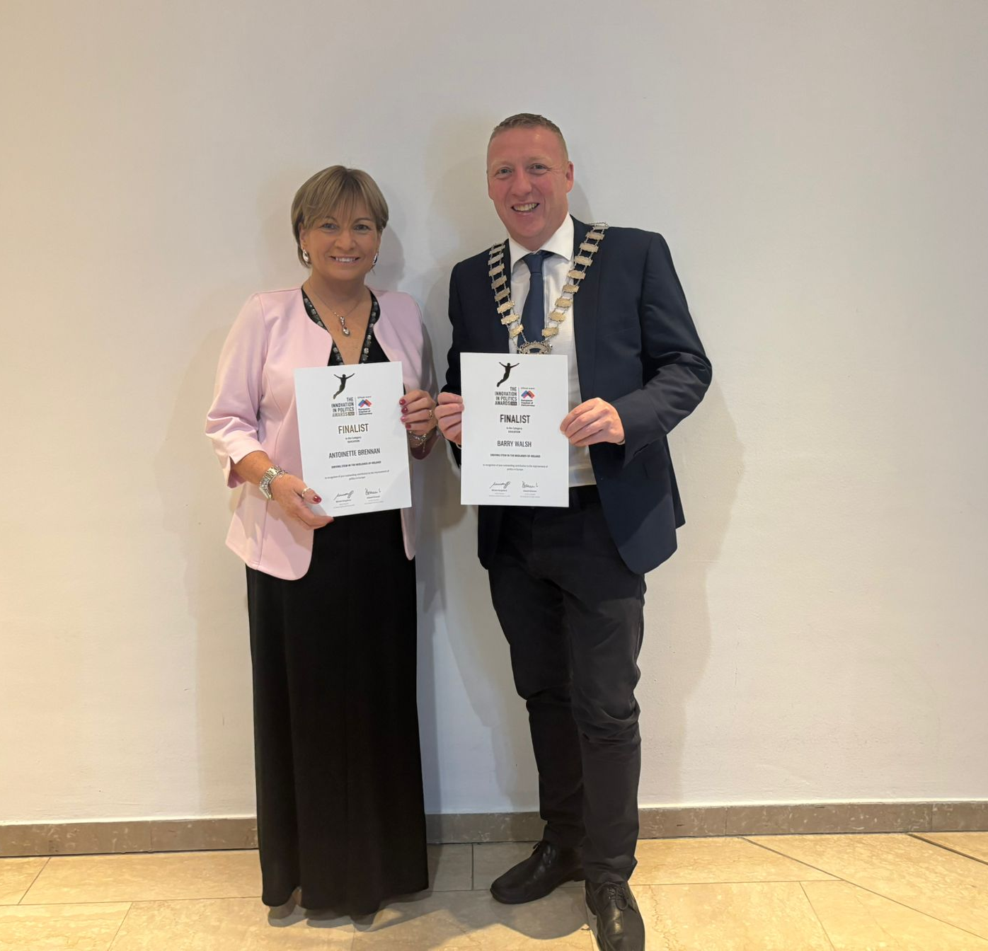 Pictured: Antoinette Brennan (Laois Broadband Officer) and Barry Walsh (Cathaoirleach of Laois County Council) with their Finalist certificates, presented at the Gala Event in Vienna.
