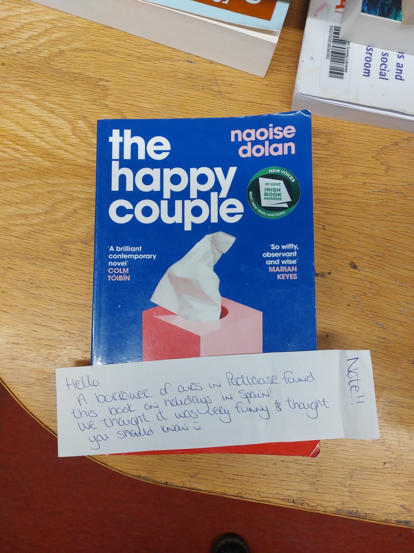 A Portlaoise library user was enjoying her holiday in sunny Spain, when she came across a copy of 'The Happy Couple' by Naoise Dolan.
