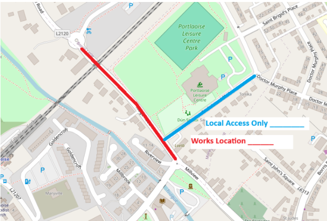 The temporary road closure on the L2120 Ridge Road, Portlaoise, from the mini-roundabout with Millview Road to the mini-roundabout at Esker Hills Estate.