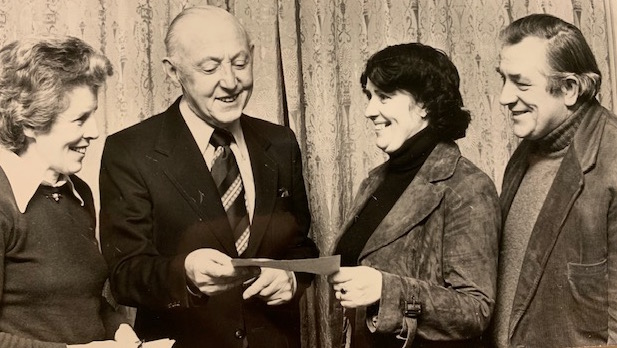 PICTURED: Johnny and Maura presenting a cheque to Peadar Murtagh and Mrs. J. Tyrrell on behalf of the Ballyroan Day Care Centre. The money was raised from a waltzing competition they organised in the Killeshin Hotel, Portlaoise, and the Happyland Lounge in Abbeyleix in the 1970s. This was one of the many charitable fund-raising events organised by Johnny and Maura over the years.