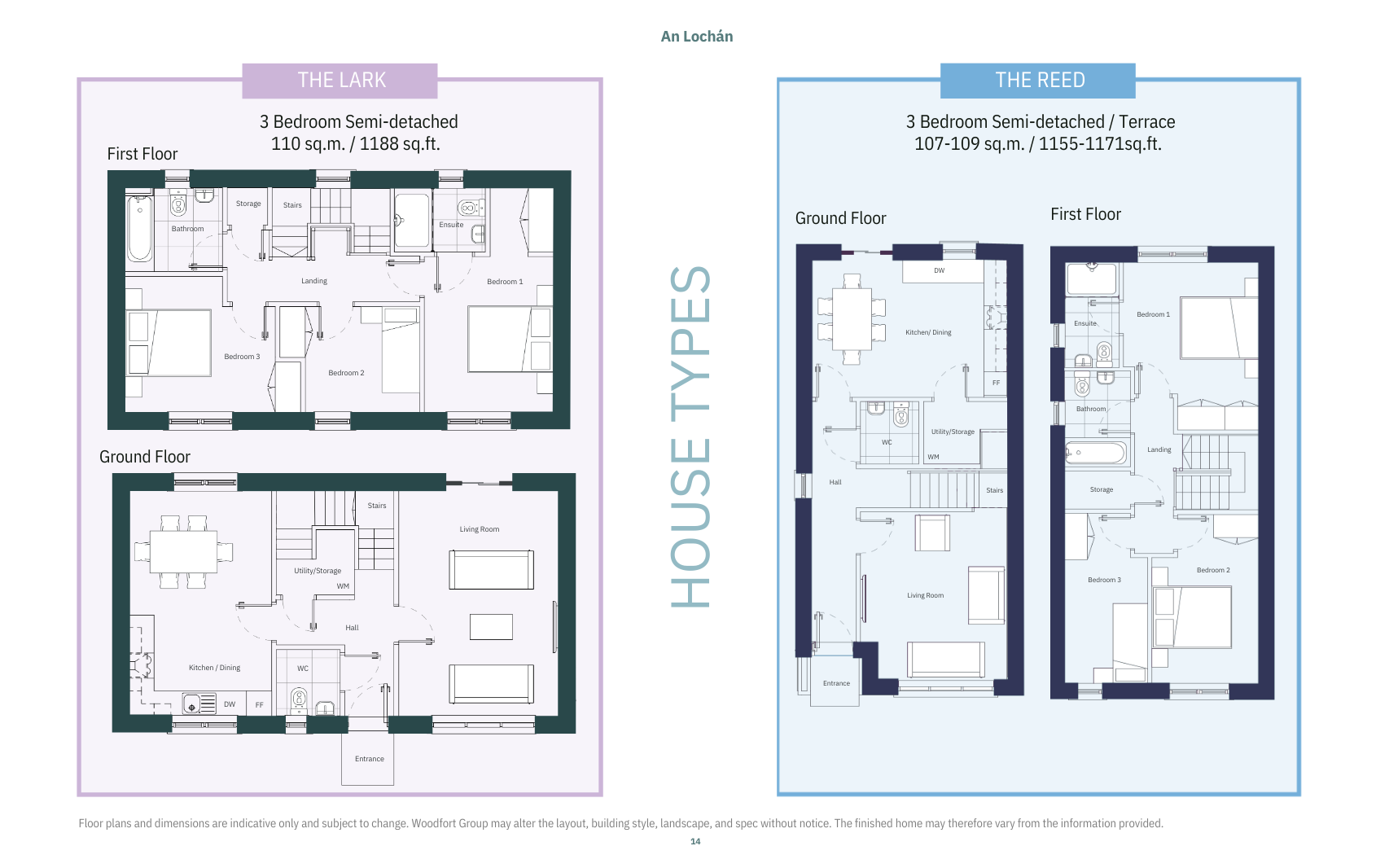 The Lark with two houses available, numbers 40 and 47, are 3 Bedroom Semi-detached houses measuring 110 sq.m. / 1188 sq.ft. The Minimum selling price is €267,500.