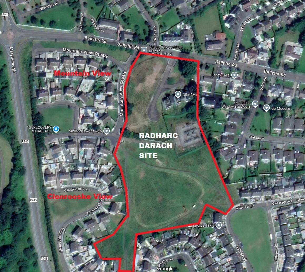 Construction is starting this October on the long delayed new estate Radharc Darach on the Ballyfin Road, replacing the vandalised and demolished housing estate Hepburn Court, and filling out the field behind it.