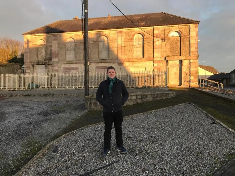 Pictured: Cllr Conor Bergin standing in front of the Borris-in-Ossory Courthouse, 2023.