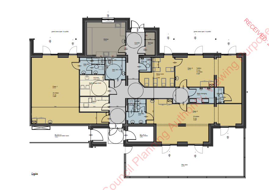 Plans show three spacious classrooms, a kitchen, a staff canteen, an office, a sleep room for children, a changing room, storage areas, three W/C for children and two for staff. There is also a sizeable enclosed outdoor play area proposed for the créche.