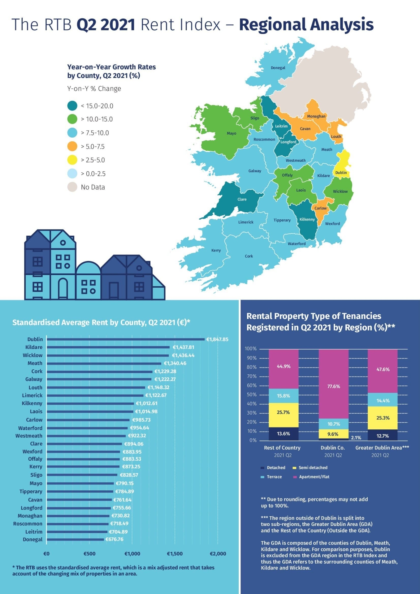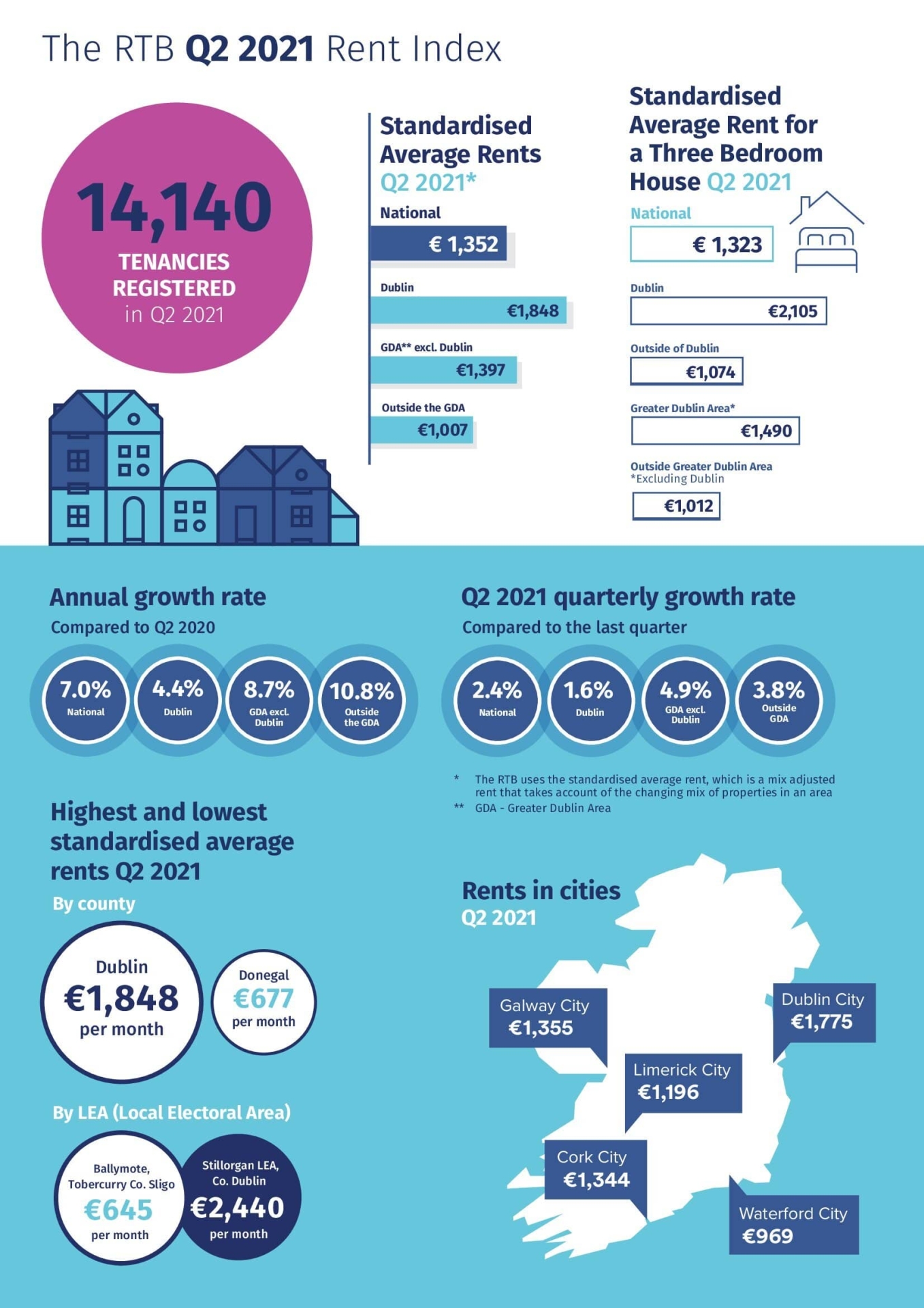 The findings are contained in the (RTB) quarterly Rent Index for the April to June period (Q2) of 2021. This report is compiled in conjunction with the Economic and Social Research Institute (ESRI). The RTB says it is the most authoritative report of its kind on the Irish rental market.