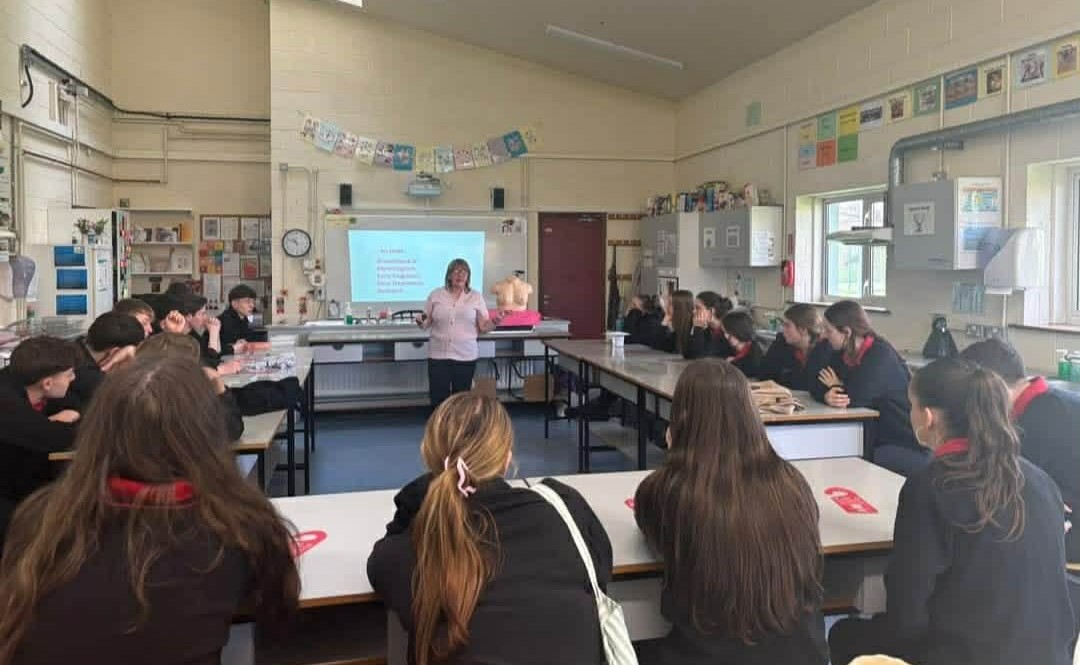 Pictured: Helen gives a talk in a Munster school