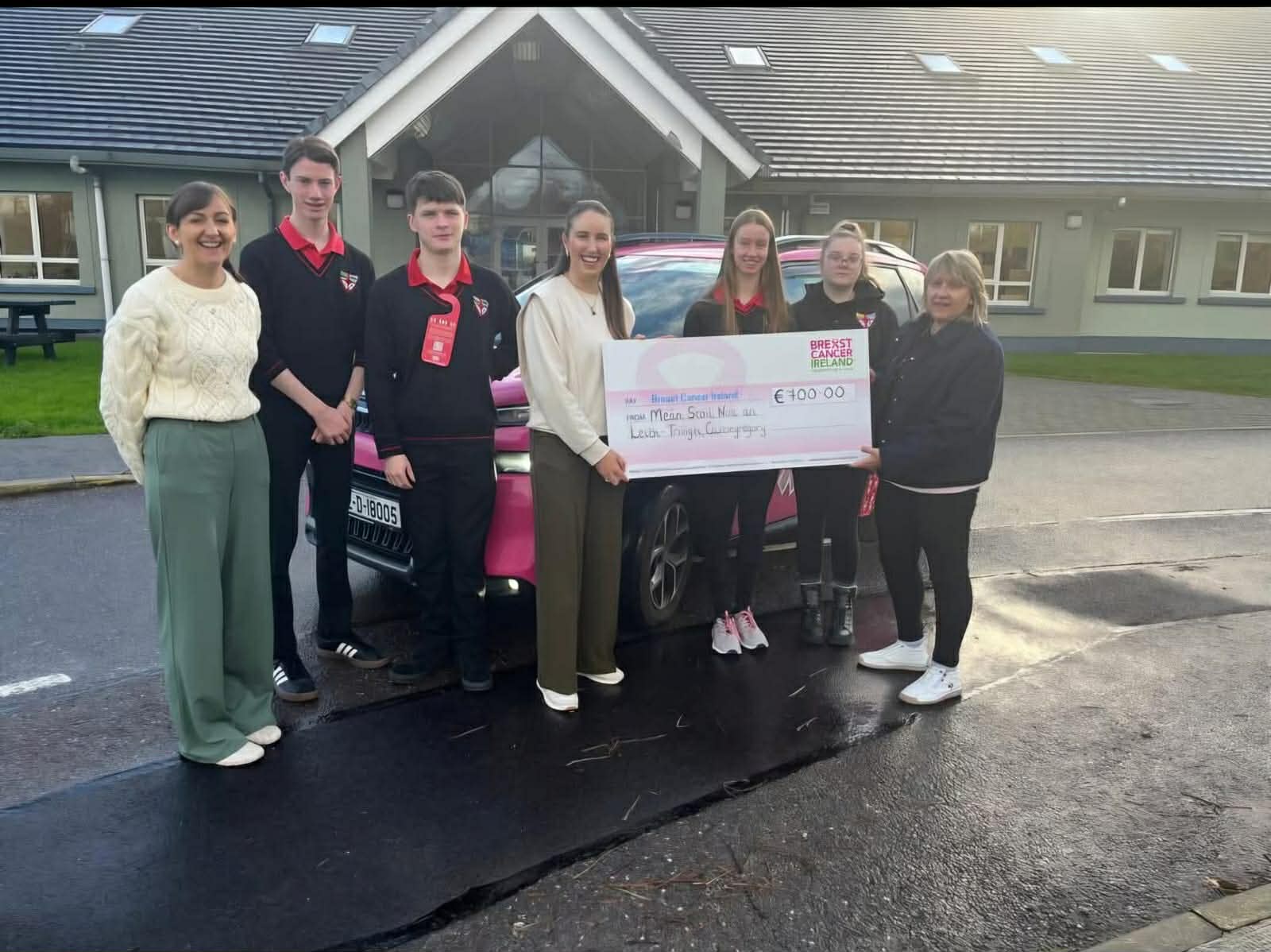 Pictured: Mean Scoil Nua an Leith Triuigh presenting Helen with a cheque for Breast Cancer Ireland