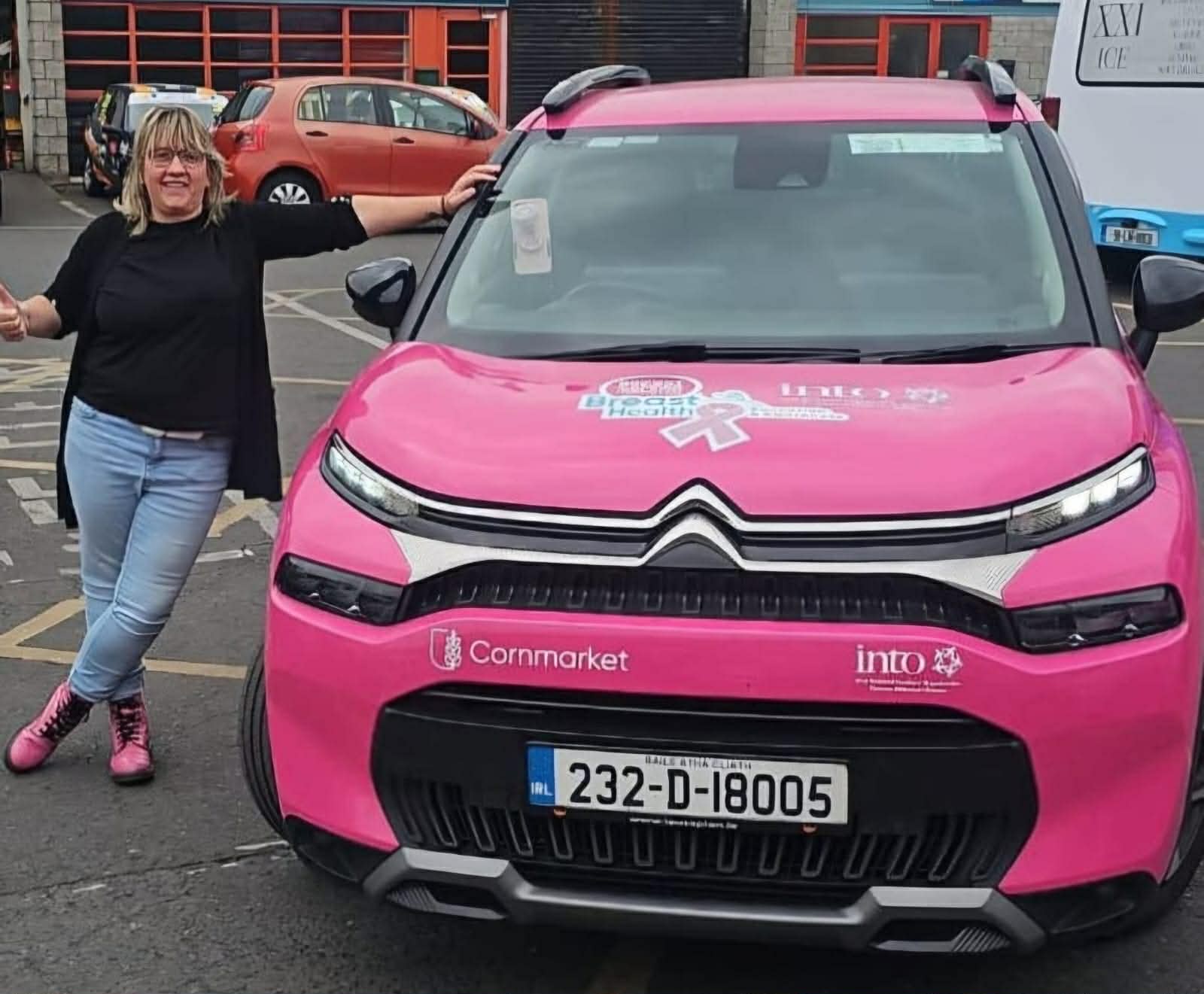Pictured: Helen with one of Breast Cancer Ireland's fleet of pink cars