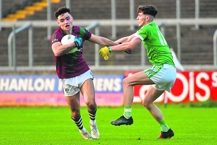 The late Ciarán O'Neill in action for Stradbally against Darragh Galvin from Portarlington in the 2023 Laois GAA Senior Club Gaelic Football Championship. Pic: Denis Byrne