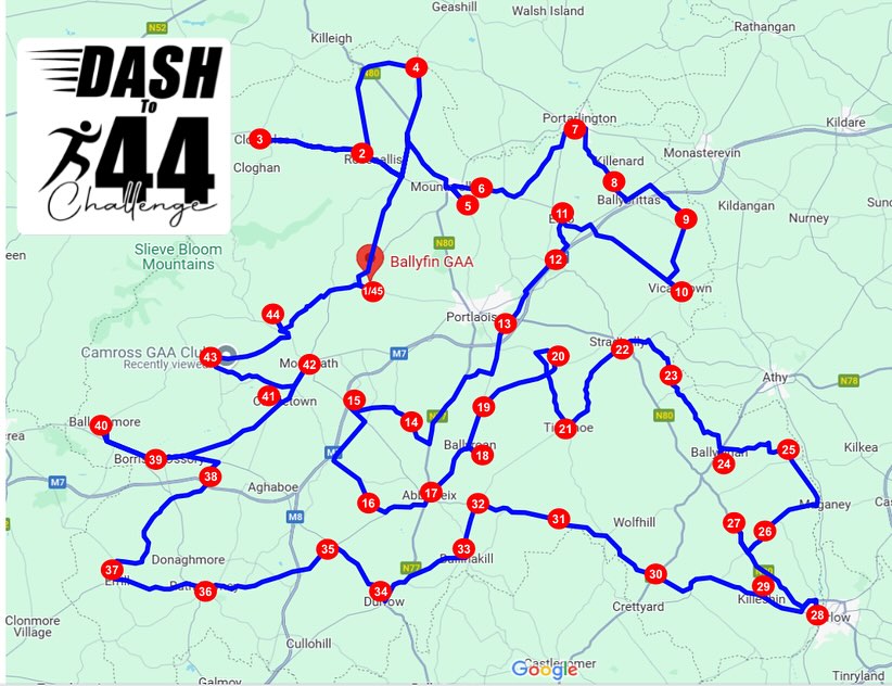 The route begins at Ballyfin NS before heading to nearby Rosenallis and continuing across the county, covering pitches from Ballacolla to St. Joseph’s. The full challenge is expected to take 15 hours, culminating in a special lap of honour at Ballyfin GAA, where Ballyfin NS and Kolbe students will join in the celebrations.