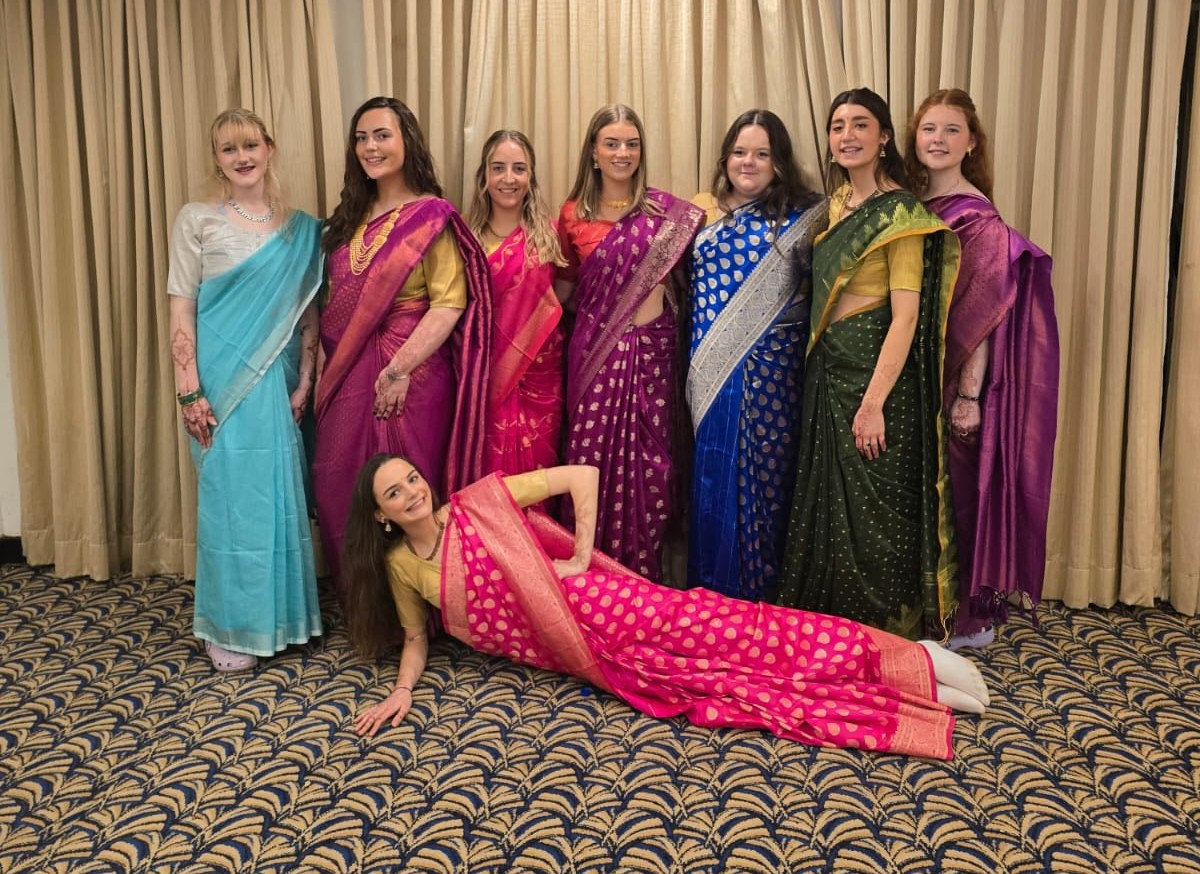 Pictured: Jane Phelan, Aoife Mortimer, Emily O'Driscoll, Olivia Little, Jessica Parkinson, Meabh Rafter, Niamh Scully, Ava Hogan (lying down) in their traditional sarees