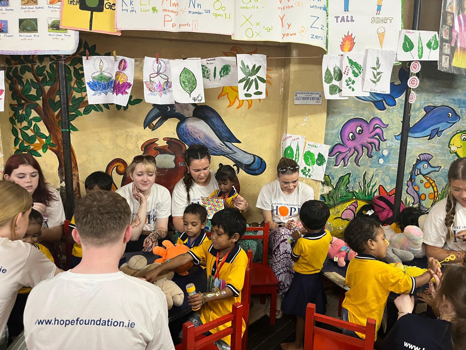 Pictured: Students Jane Phelan, Aoife Mortimer, and Olivia Little in Panditya Creche, Kolkata
