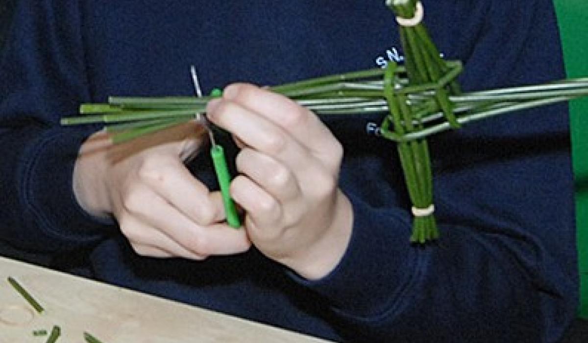 - Turn the two rushes held together 90 degrees anti-clockwise so that the open ends of the second reed are pointing vertically upwards.