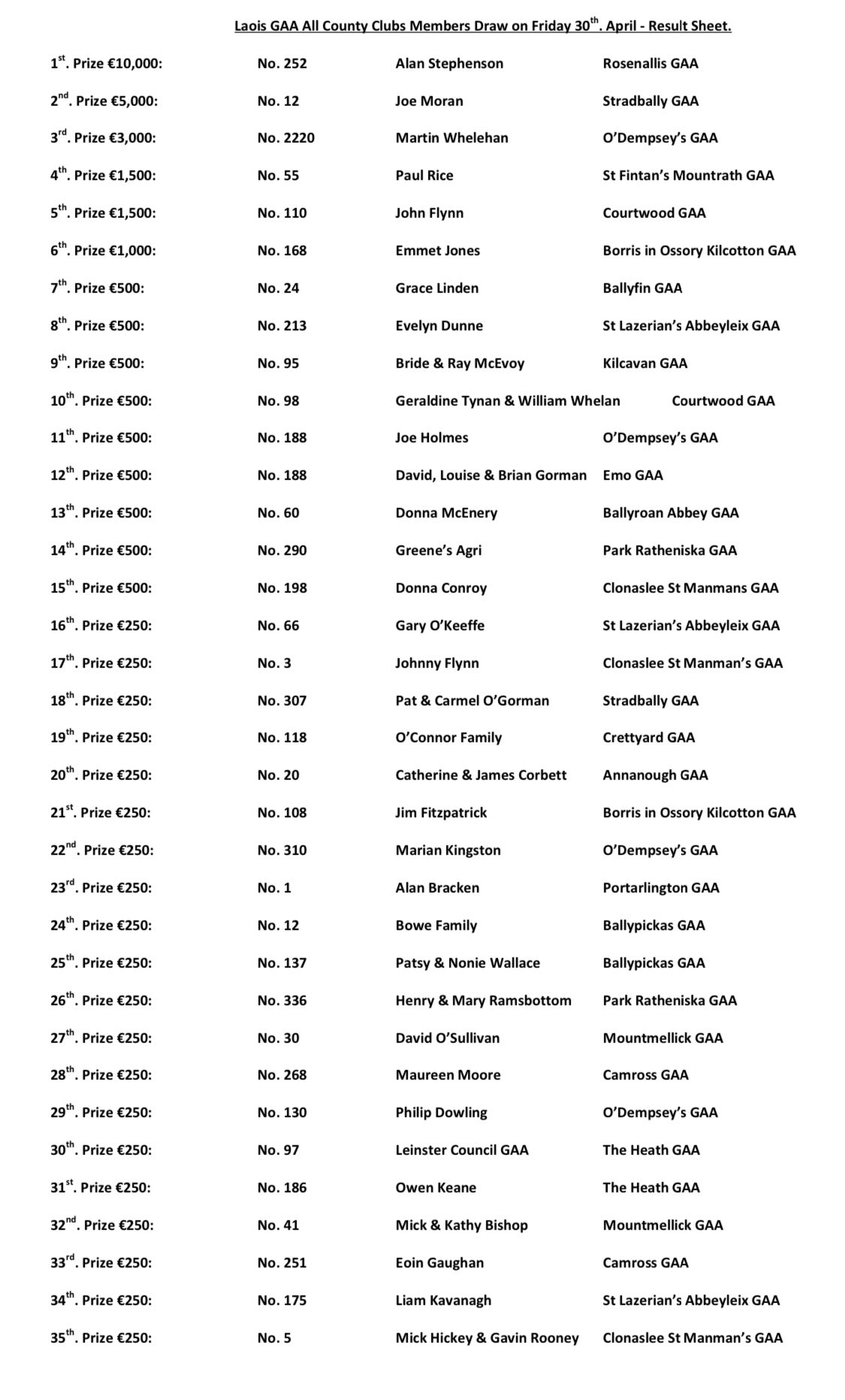 The winners of the first draw were as follows with Alan Stephenson of Rosenallis GAA claiming the 10,000 euro first prize.