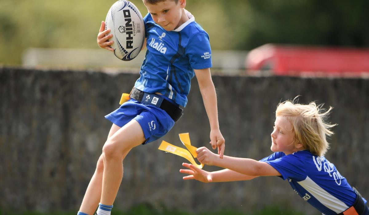 Robert Lewis, age 6, is taged by Lochlainn O'Brien-Crosland, age 6, during the Bank of Ireland Leinster Rugby Summer Camp at Portlaoise RFC recently. Photo by Matt Browne/Sportsfile