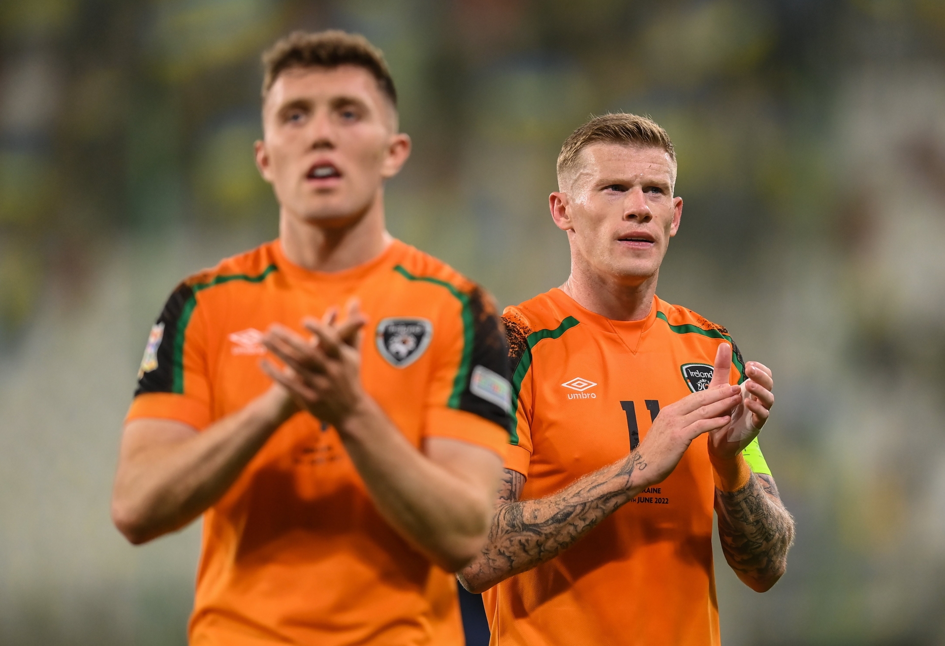 James McClean, right, and Dara O'Shea of Republic of Ireland after the UEFA Nations League B group 1 match between Ukraine and Republic of Ireland at LKS Stadium in Lodz, Poland. Photo by Stephen McCarthy Sportsfile