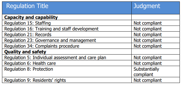 The report found the nursing home non compliant in relation to Staffing, Complaints Procedure, Health Care, Training and Staff Development, Record keeping, Governance and Management, Individual Assessment and Care Plan, Residents' rights and it was substantially compliant in relation to Protection.