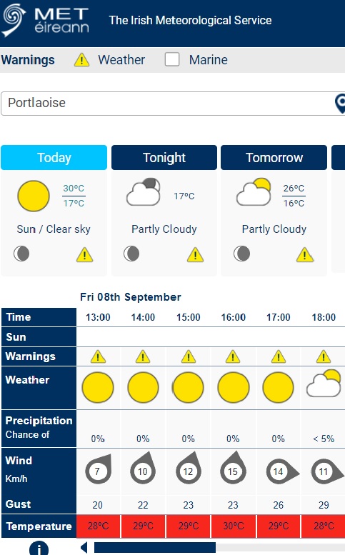 It shows the temperature in Portlaoise peaking at 30 degrees in Portlaoise at around 4pm. The Laois Weather website which records live temperatures in Laois and is referenced by Met Éireann showed temperatures at 26 degrees at 1pm.