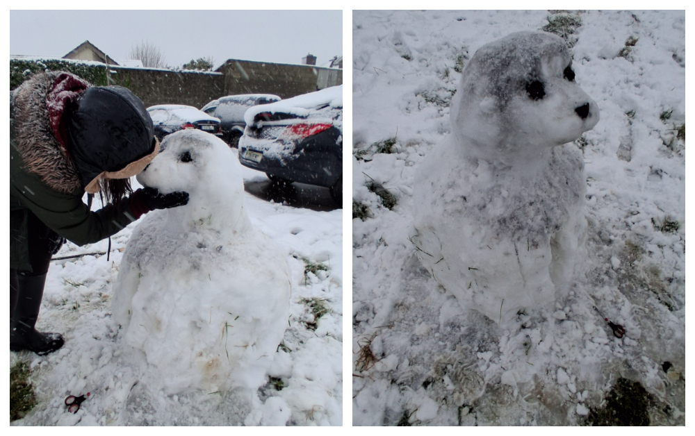 Megan Tynan, age 12, a pupil in Gaelscoil Phortlaoise sculpted this very realistic dog in the snow. Well done Megan.