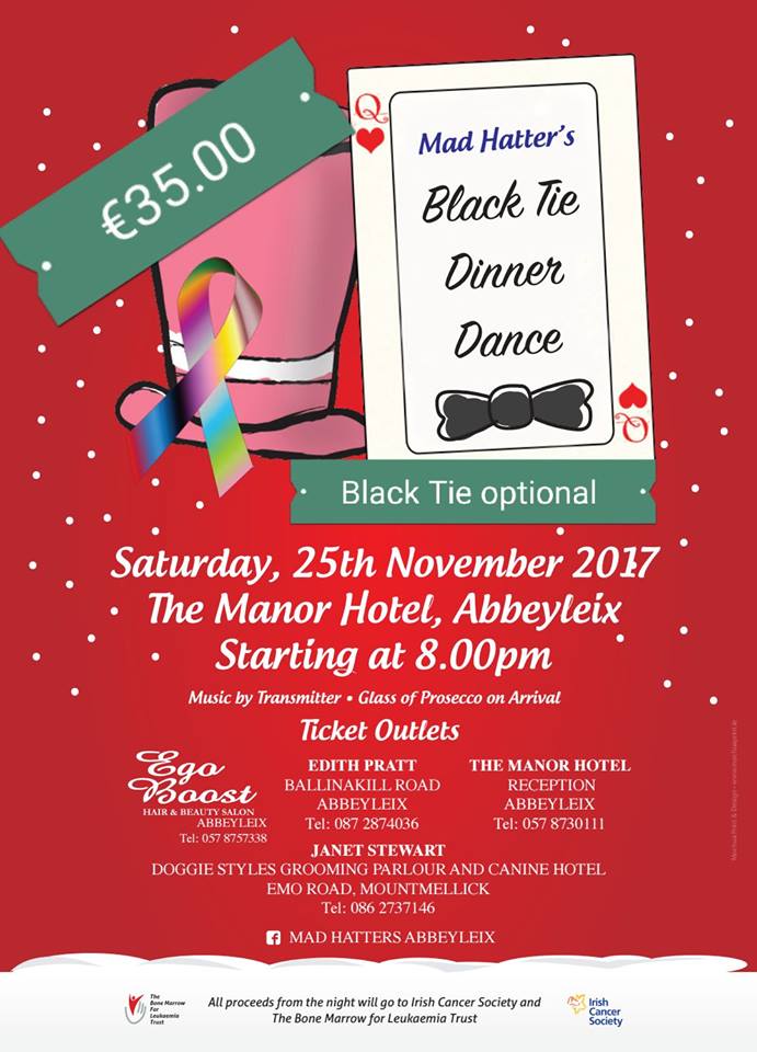 The dinner dance will take place on Saturday, November 25 at The Manor Hotel, Abbeyleix at 8pm.