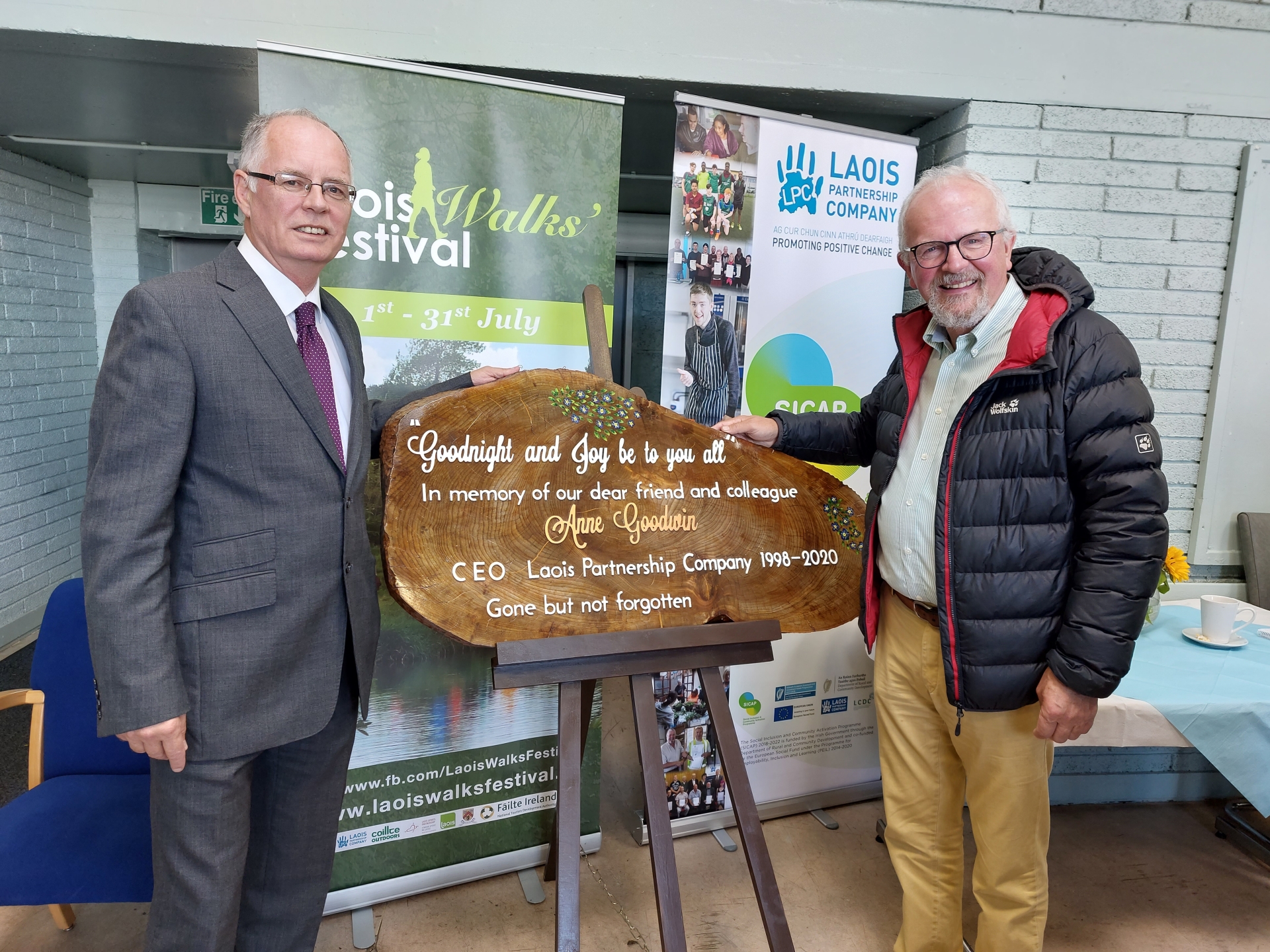 A beautiful wooden plaque was unveiled in Ms Goodwin's memory, created by Mountrath Men's Shed, inscribed with a line from The Parting Glass, a special song for her.