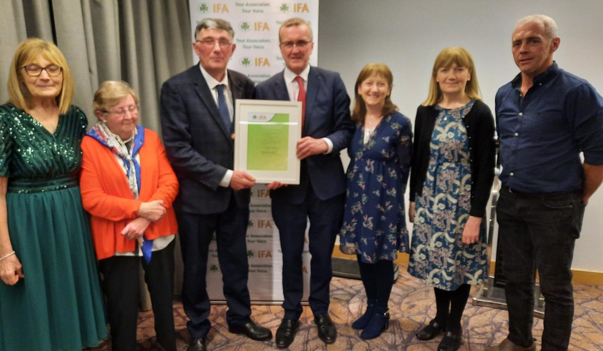Michael Bergin receives the award from Tim Culinan, IFA President, surrounded by his wife Mary and sisters Sadie, Mary and Anne. Also pictured is Tom Meade Chairman of Mounthrath IFA Branch at the M