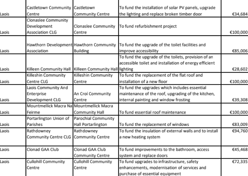 “Communities across Laois, from Clonaslee to Clonad, from Rathdonwey to Mountmellick, from Portarlington to Killeshin will now be empowered to make the changes they need to their community centres to ensure they are up to a high standard.