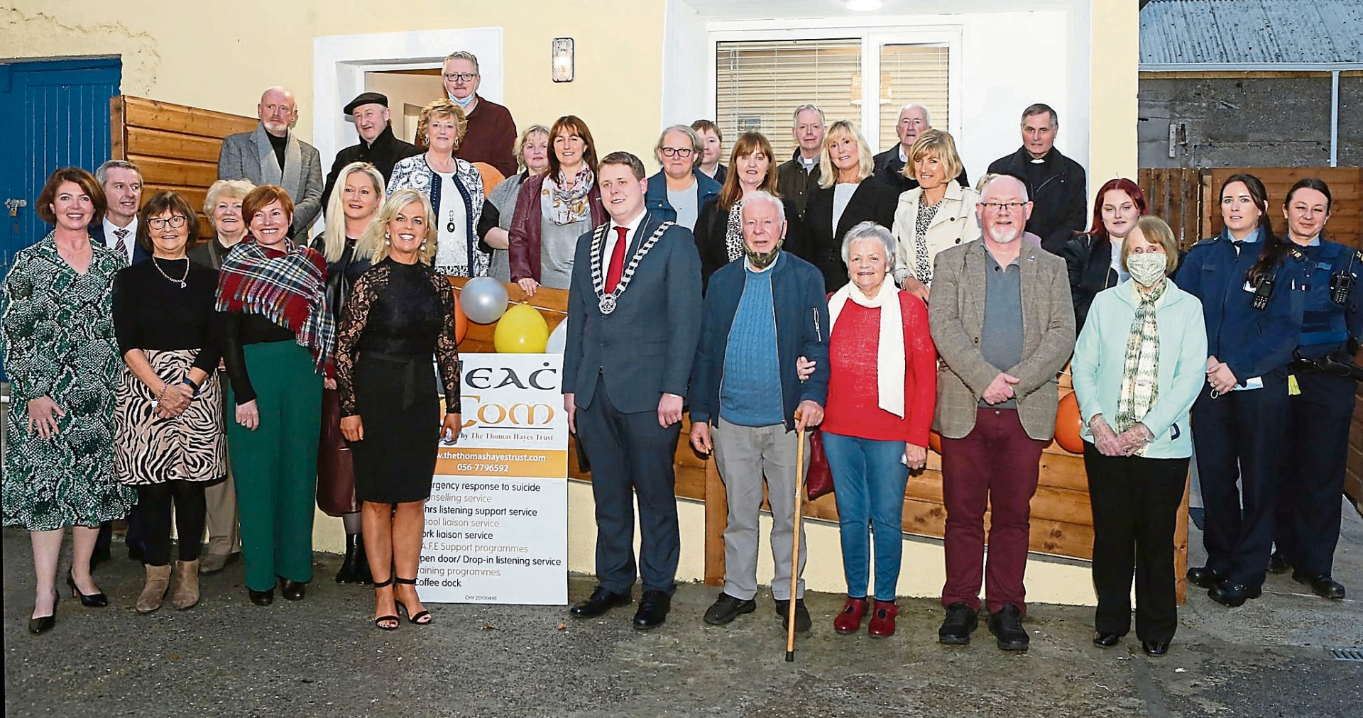 Angela Hayes (CEO Teac Tom) pictured in 2021 with Cllr Conor Bergin, local people, Teac Tom staff and board members, Gardaí at the official opening of Teac Tom Counselling Centre in Stradbally. Photo: Michael Scully