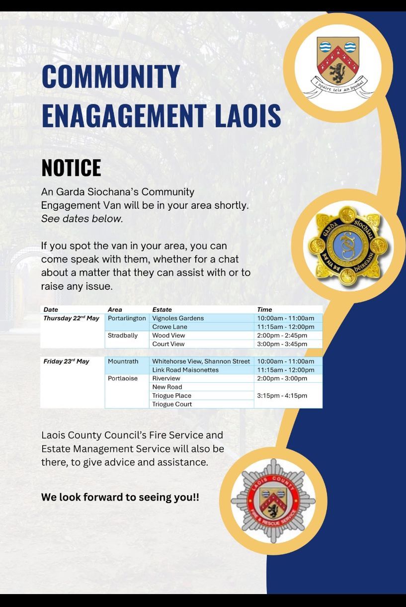 Laois Gardaí are holding community engagement sessions in Portarlington, Stradbally, Mountrath and Portlaoise.
