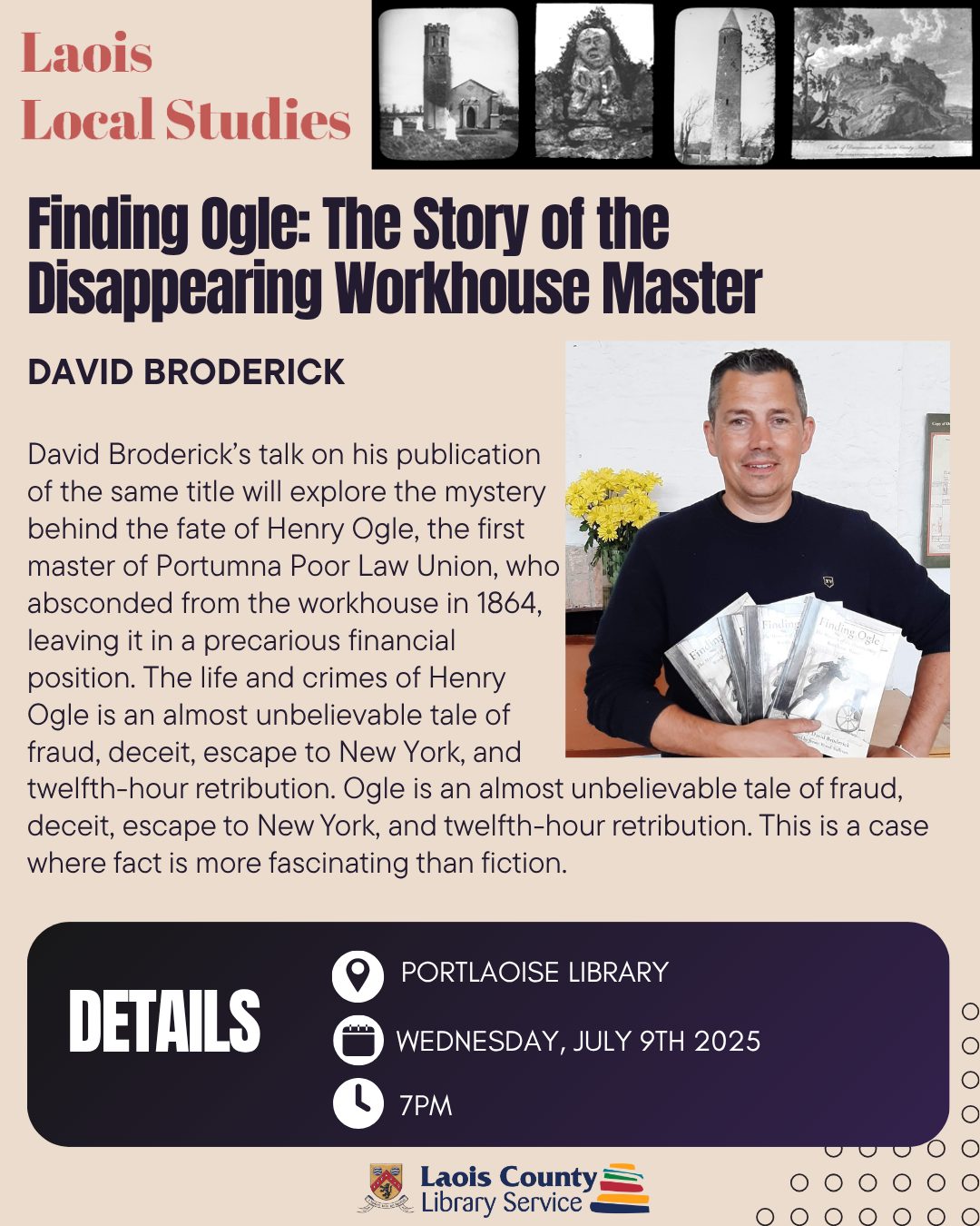 David Broderick is Creative Communities Engagement Officer with Laois County Council. He has a master’s degree in Applied/Public History from UL and worked in Portumna Workhouse Museum as a history researcher. His book Finding Ogle was published in 2019.