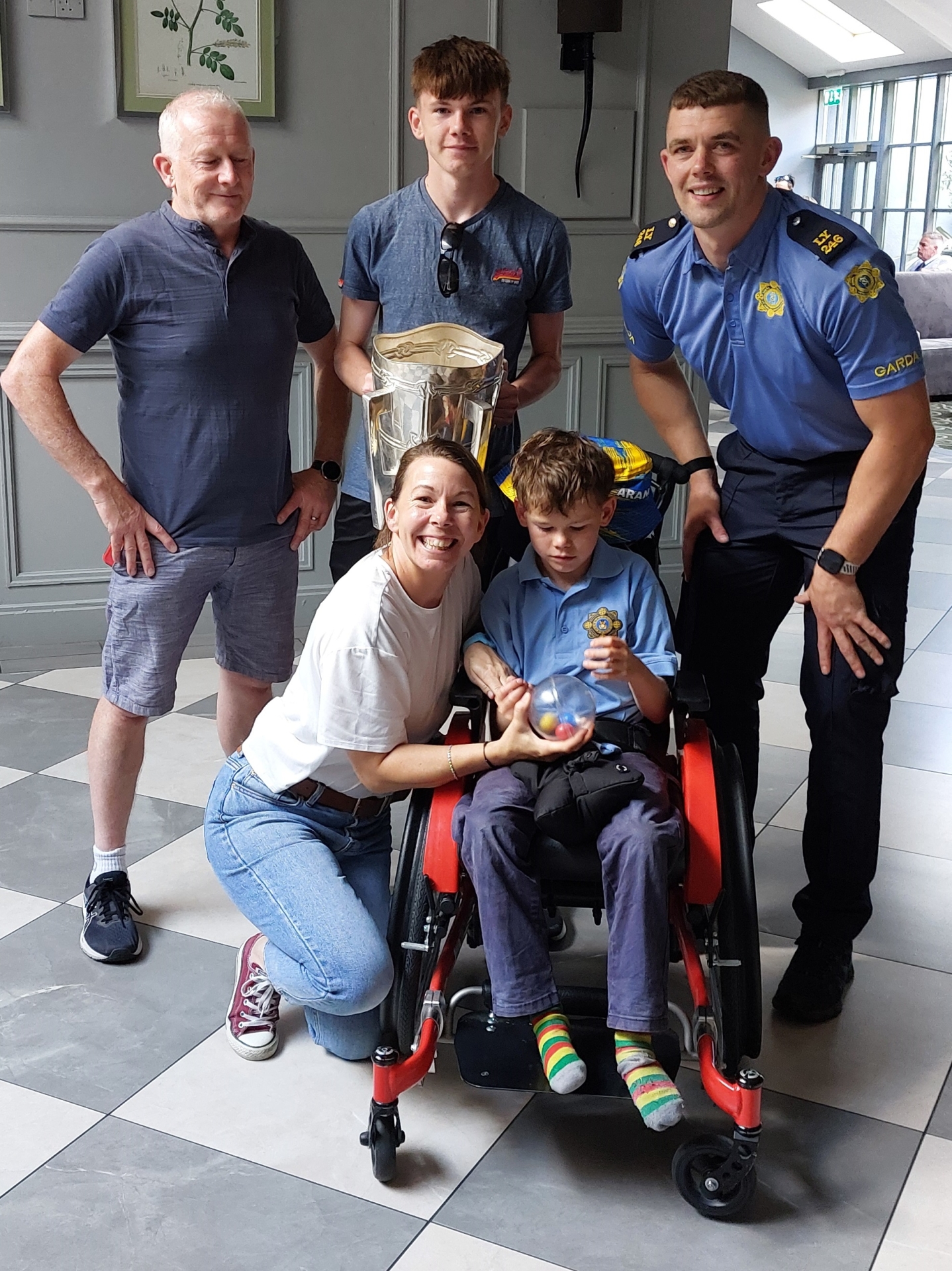 Little Blue Hero Jamie Mannion with his parents Siobhan and Declan, brother Ryan and Garda Ronan Maher.