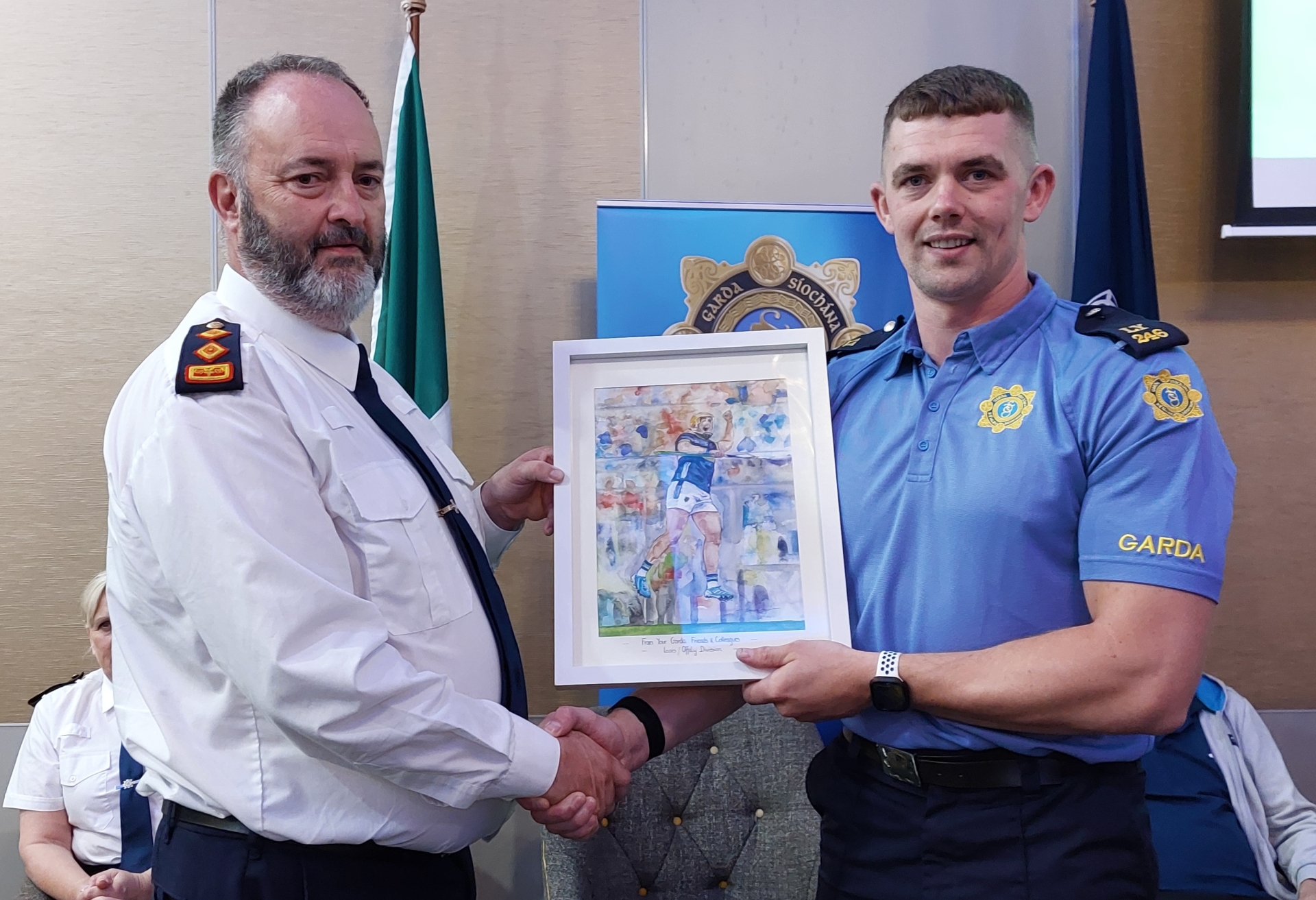 Laois Offaly Division's Chief Superintendent Tony Lonergan presents a painting gifted by members to Garda Ronan Maher.