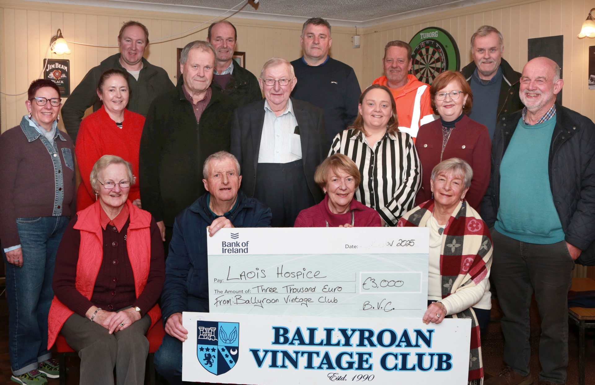 The Ballyroan Vintage Club committee presenting their cheque from the 2024 event to Laois Hospice. Photos: Michael Scully